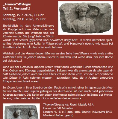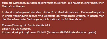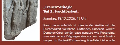 Beleuchtet wird angelehnt an den Totensonntag der römische Grab- und Bestattungskult. Nachgegangen wird dabei u.a. folgenden Fragen: Welche Jenseitsvorstellungen lagen dieser Praxis zugrunde? Welche Rolle kam dabei Gottheiten zu, die mit der Unterwelt in Zusammenhang standen, darunter Proserpina, die gallorömische Herecura oder der Seelenbegleiter Mercur? Warum besitzen viele Unterwelts-Gottheiten gleichzeitig auch einen Fruchtbarkeits-Aspekt? Eindrucksvoll sind in diesem Zusammenhang etliche archäologische Zeugnisse aus dem Zabergäu und dem römischen Güglingen, die das Römermuseum in seiner Dauerausstellung bereithält.