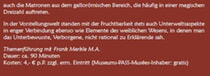 Diese Führung setzt sich mit den Exponaten auseinander, die mit der Landwirt- schaft in Verbindung stehen und die in diesem Zusammenhang auftauchenden Fragen thematisieren. Wurde von den Römern beispielsweise bereits Weinbau in der hiesigen Region betrieben? Passend zum christlichen Erntedankfest will sie zu- dem der Frage nachgehen, ob es in römischer Zeit ähnliche Erntedankfeiern für die Götter gab.